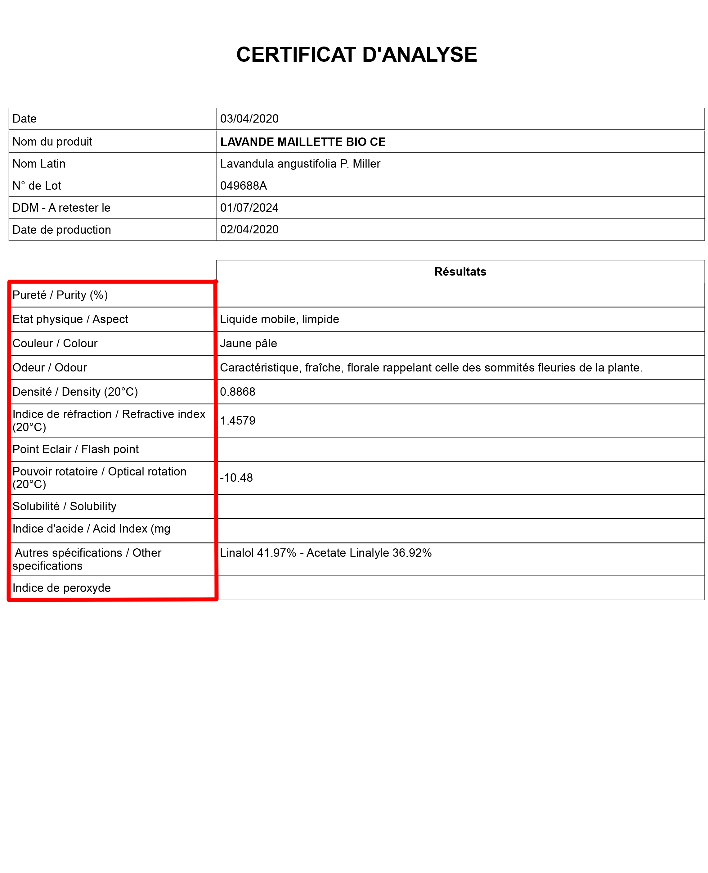 每一批精油出廠時都必須附上COA(Certificate of Analysis)「檢驗分析報告」, COA代表每一批貨的成份分析檢驗值,而這些物化性質的檢驗數據,都必須符合TDS的規範。